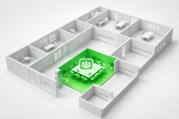 Das ausgewählte System wurde in MS Teams integriert und an die unternehmensspezifischen Anforderungen angepasst. Ein Fokus lag auf der digitalen Visualisierung der Büroräume, sodass kombinierbare Räume, Desksharing und Ressourcen klar dargestellt werden. Schulungen und eine Testphase stellten sicher, dass das System praxisnah funktioniert und leicht bedienbar ist.