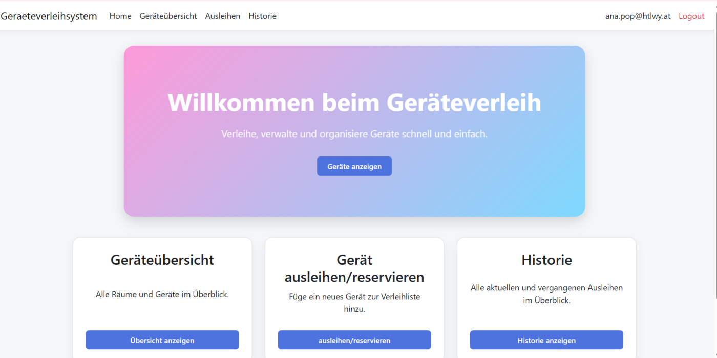 Im Projekt wird ein webbasiertes Verleihsystem für die HTL Waidhofen/Ybbs entwickelt. Es ermöglicht die übersichtliche Verwaltung von Geräten wie Laptops oder Werkzeugen. Durch Anmeldung mit dem Microsoft-Schulkonto sowie klare Rollen und Rechte werden Ausleihe, Rückgabe und Reservierung einfach, transparent und zuverlässig digital umgesetzt.