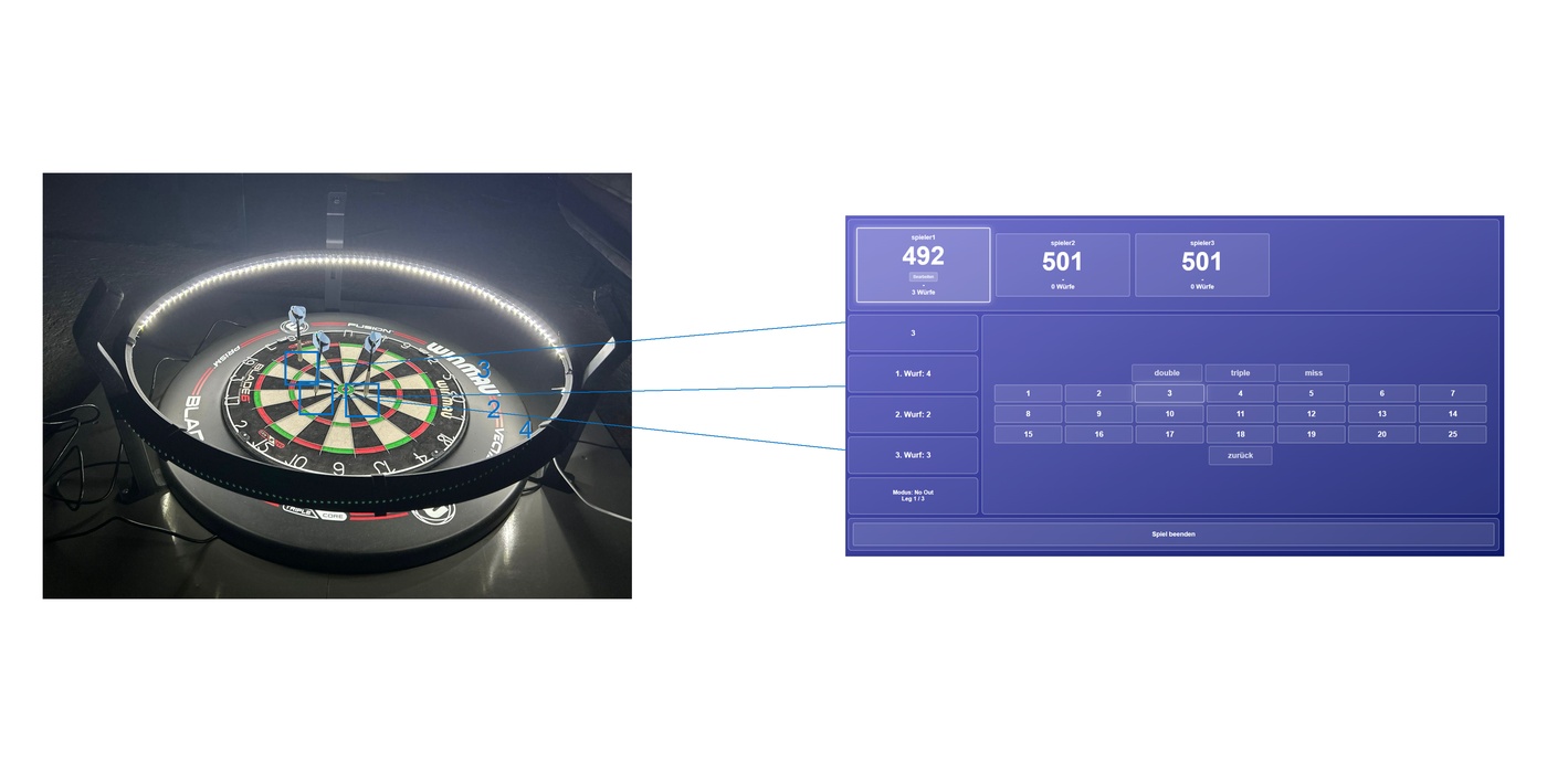 Unser vollautomatisches Scoring-System revolutioniert Steel-Darts: Ein Setup aus drei Kameras und künstlicher Intelligenz (YOLO) erfasst Pfeile in Echtzeit. Das eliminiert Rechenfehler, visualisiert den Spielstand live im Web-Interface und ermöglicht Spielern vollen Fokus auf den Wurf.
